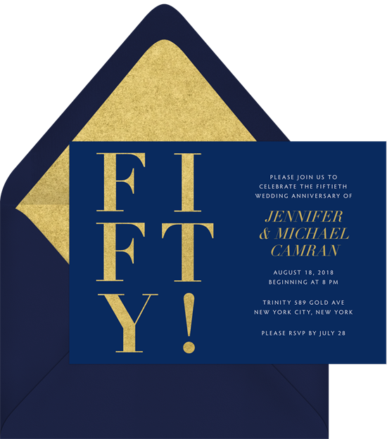 With this anniversary greeting card, “fifty” is proudly written in big, bold font for all to see (exclamation point included). Write the details of your anniversary reception on the right of the card, and remind guests to bring their dancing shoes.