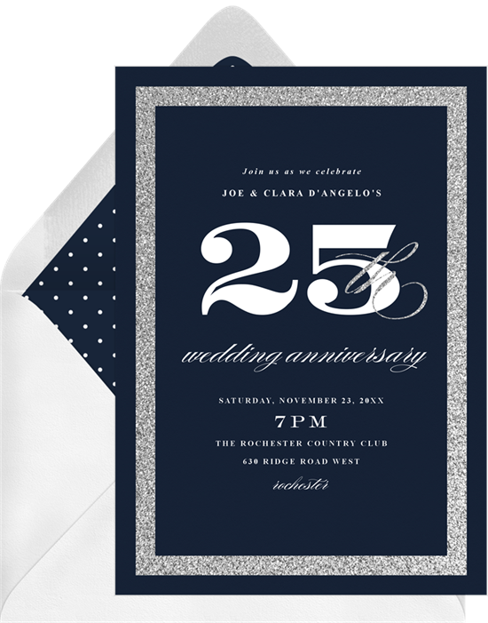 You never could have predicted how the last 25 years turned out, but you’re sure happy you had your #1 by your side. To celebrate your forever partner, forever roommate, and forever friend, send out this luxurious anniversary invitation. With a large “25” written in white lettering across a navy background, it invites your friends and loved ones to join in on your silver anniversary.