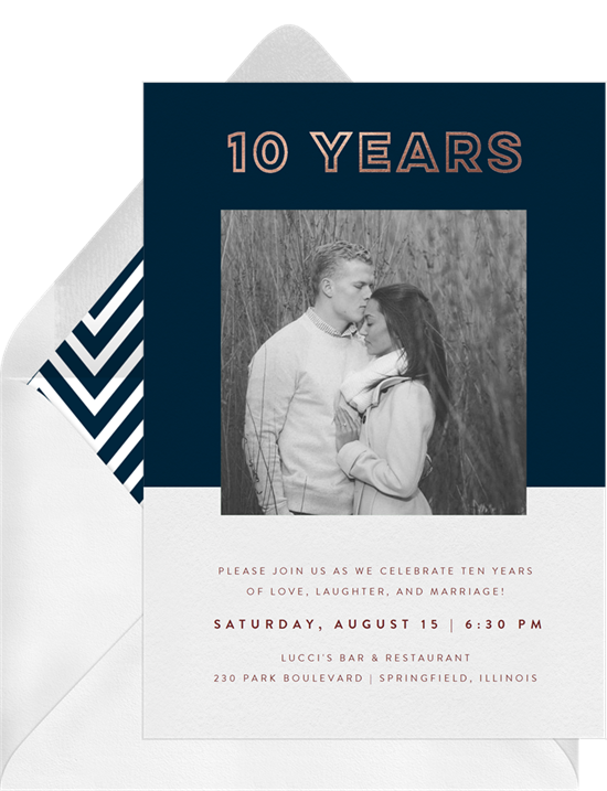 This modern invitation carries a bit of pizazz with a sparkling black and gold color palette. It’s the ideal way to toast to 10 years of marriage — and still swoon over each other like you did at your engagement party.