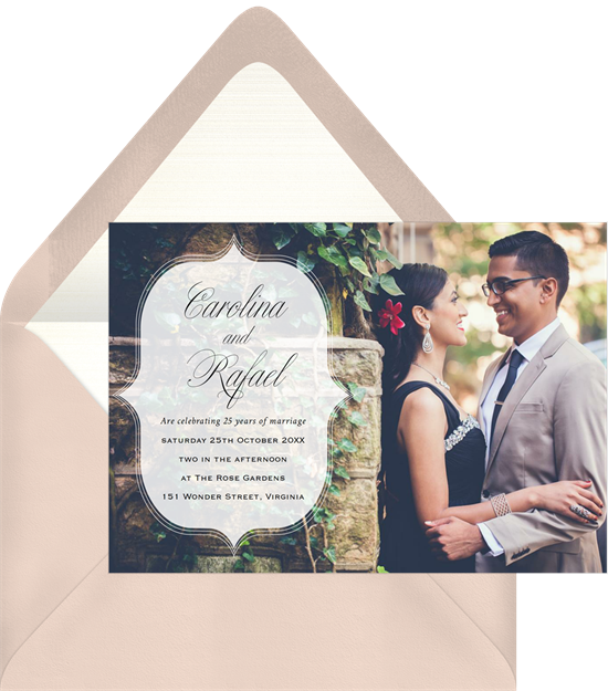 This luxe invitation is jaw-droppingly elegant, fit for a gala, masquerade, or, of course, your 25th wedding anniversary celebration. With a black and gold color palette, you may consider hosting a dolled-up cocktail hour or a black-tie-only affair for your anniversary party. The beautiful lettering and golden frame certainly add a touch of refinement, building excitement for your special evening.
