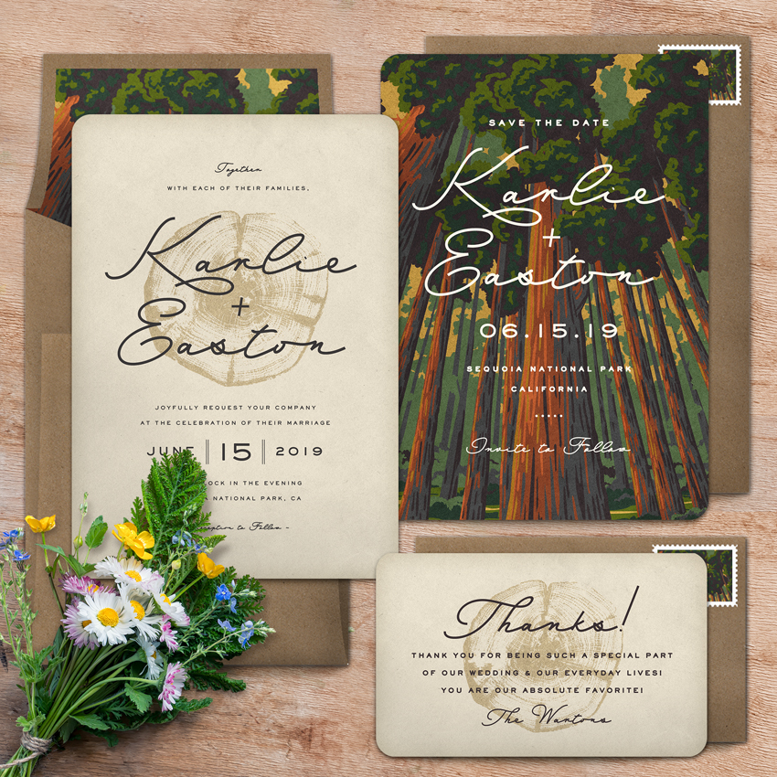 Filled with designs that were inspired by American icons like the giant sequoias, to natural wonders like the Rocky Mountains, each exclusive invitation suite is a reflection and celebration of our nation’s diverse heritage. Each of the invitation suites includes a matching save the date, invitation, and thank you card.