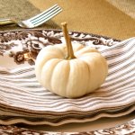 Let’s talk colors first.  Despite the dip in temperature, autumn is all about warm colors: orange, yellow, red, brown. Warm colored napkins, candles, pumpkins (various colors and sizes), and pinecones are a great starting point for preparing your autumn tablescape. Spread the pumpkins, pinecones and candles across the length of the table or place them on large wood coasters.  You can also add a floral arrangement in a low vase.  My personal favorites are a combination of yellow beech leaves, pale-pink and white dahlias, and gold spider mums or a mixture of pomegranates, red viburnum berries, ranunculus and a couple green leaves to balance out the warm colors.