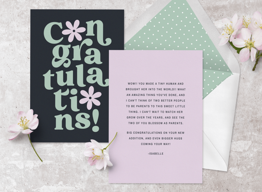 Welcoming a new baby is so exciting. It’s a huge life moment for the proud parents who have a lifetime of firsts and joyful moments ahead of them. Share that excitement with them by choosing a gorgeous congratulations card, finding the perfect wording, and sending a thoughtful gift.