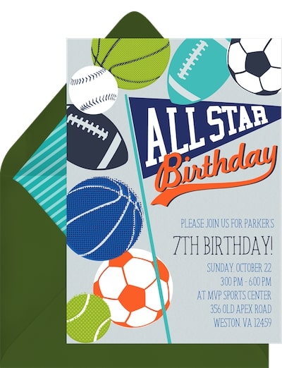 Does your child love all types of sports? This vibrant sport-themed invite features different balls, making it perfect for a baseball-themed shindig. Use it to invite guests to an All-Star baseball party and get ready to hit a home run.