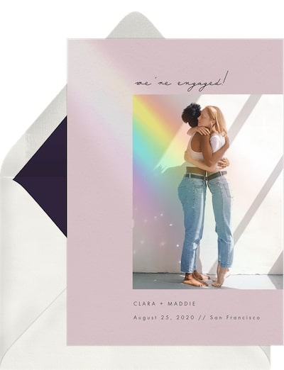 We love this rainbow light leak engagement announcement, but there are plenty to choose from. Whether you love boho, retro, modern, classic, or florals, there’s a card to suit your personal style.