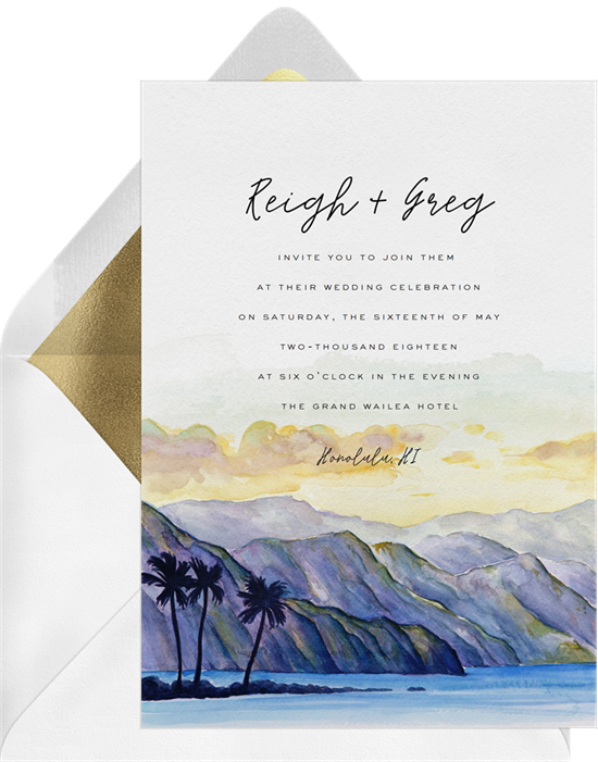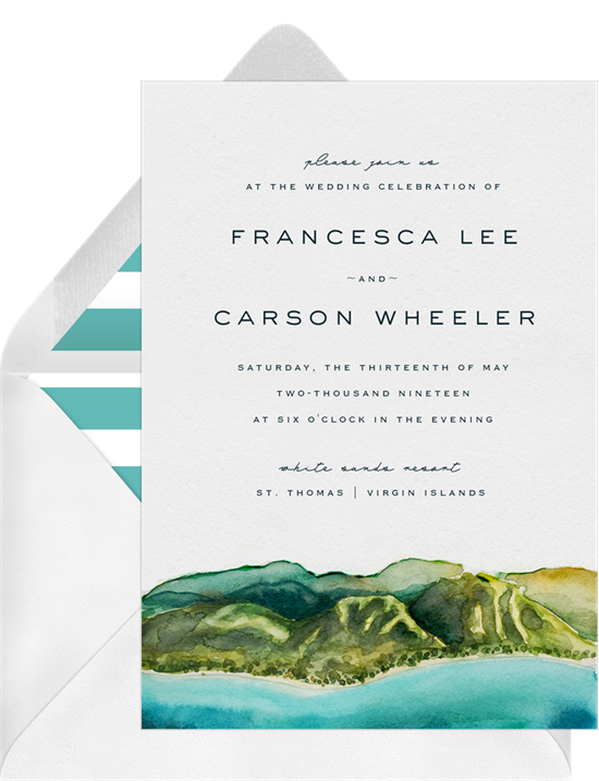 Once you’ve decided on the specifics, choose a destination wedding invitation that speaks to your specific location. Tropical hues are perfect for a Mediterrenean affair. Or set the scene with subtle blues for a New England celebration.