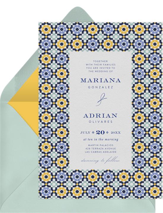 Graphic tiles reflect timeless Mediterreanean style, perfect for a Moroccan affair or Italian soiree. Pick from an array of classic colorways to pair with your wedding’s color scheme. European design is met with geometric text for one-of-a-kind style.