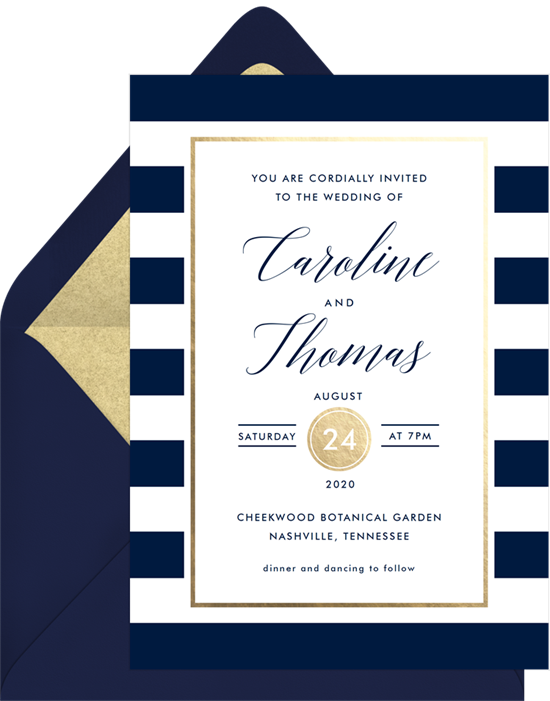 Nothing says nautical wedding invitation more than classic navy and white stripes. This customizable template is perfect for a nautical affair wherever you sink your anchor — from Florida to Arizona.