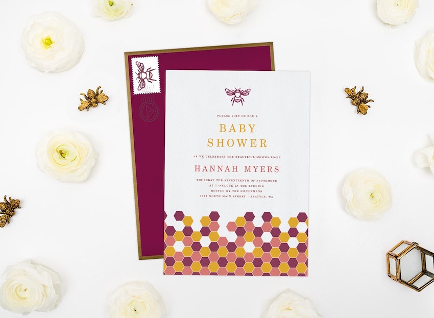 Invite your guests to join you for a wonderful bee-themed event with this honeycomb baby shower invitation. The gorgeous deep tones are a lovely way to honor the theme, without sticking to the classic yellow and black.