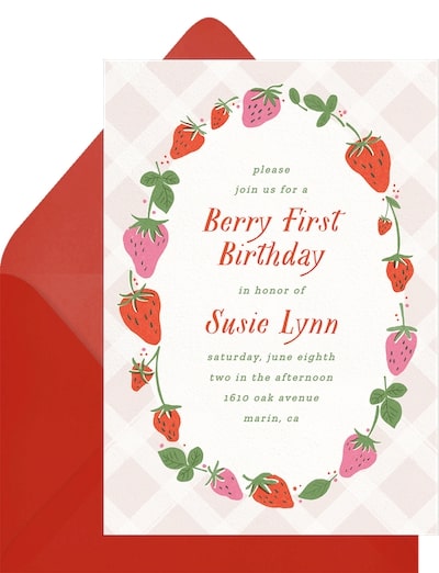After you’ve finalized the details, you can really dive into finding an invitation that feels like an ideal match for the type of berry first birthday party you’re planning.