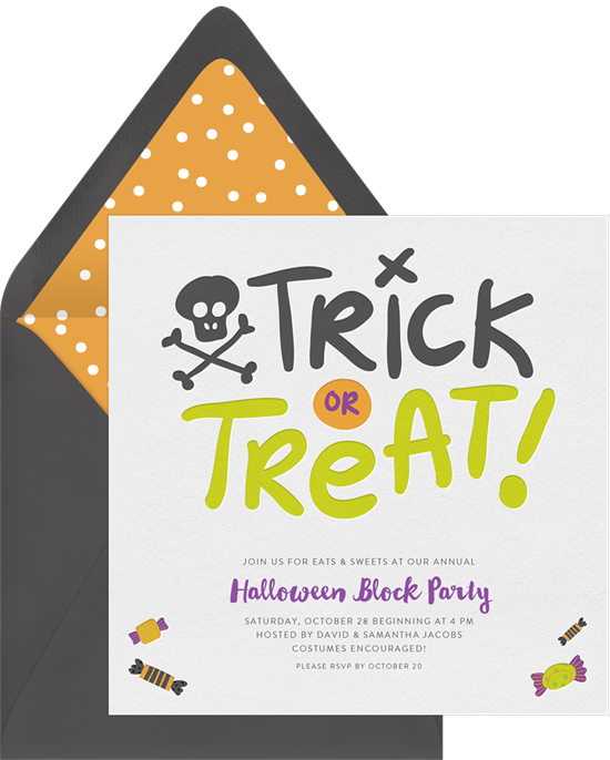 If you’re hosting a block party, group trick-or-treat, or trunk-or-treat affair, you can’t go wrong with this festive Halloween party invite. Cartoonish text features a cut-out effect for a handmade look. Festive orange and green is kid-friendly, and candy illustration suggests there will be plenty of sweets.