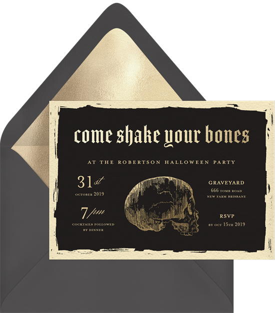 This gold foil invitation looks like a scientific note, complete with an intricate skull illustration. A rugged frame and antique lettering complete the vintage aesthetic. The result is elegant but thoroughly creepy for grown-up ghouls.