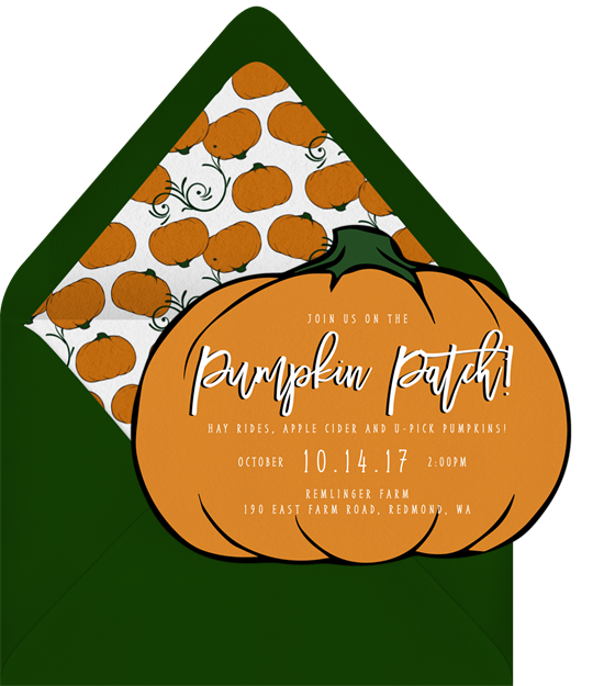 This die-cut invitation is great for pumpkin carving parties or days at the farm. Playful script and whimsical lettering suggest a family-friendly event. Textural paper and a custom envelope liner complete the package.