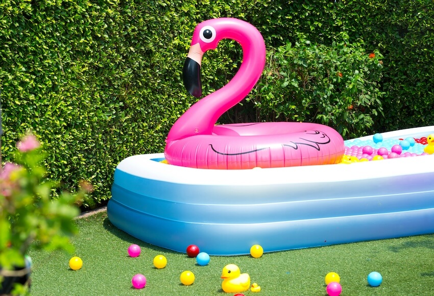 You’ll also want to clear space for everyone’s pools. Create a designated area where guests will arrange their inflatable pools. Make it easier for guests to set up their pools by providing a portable inflator for floaties and a hose for filling up the pools. Set up baskets with essentials like sunscreen, sunglasses, and hats in case anyone forgot to pack their fun accessories.