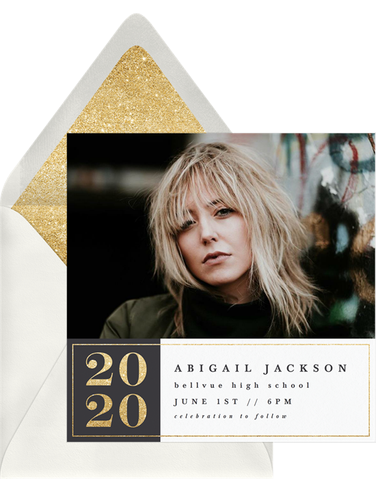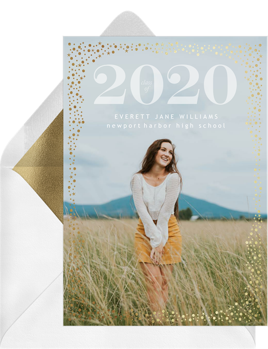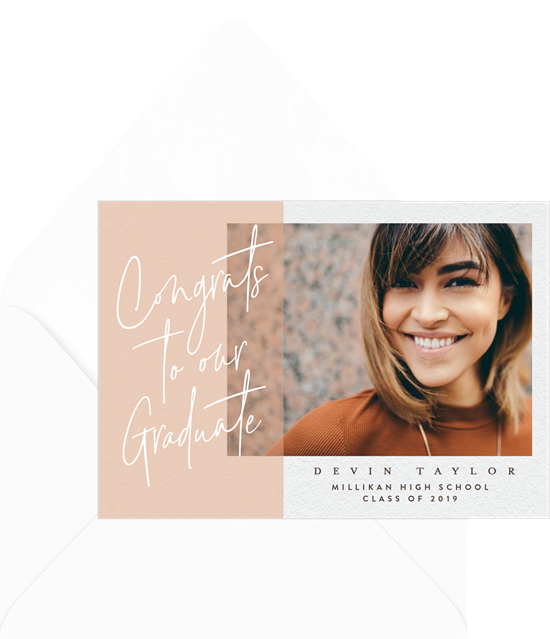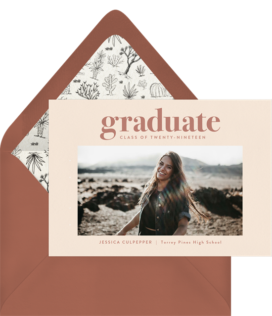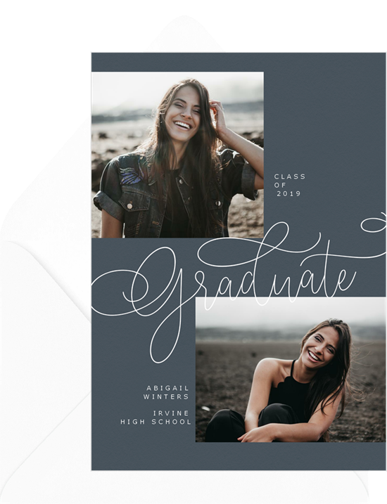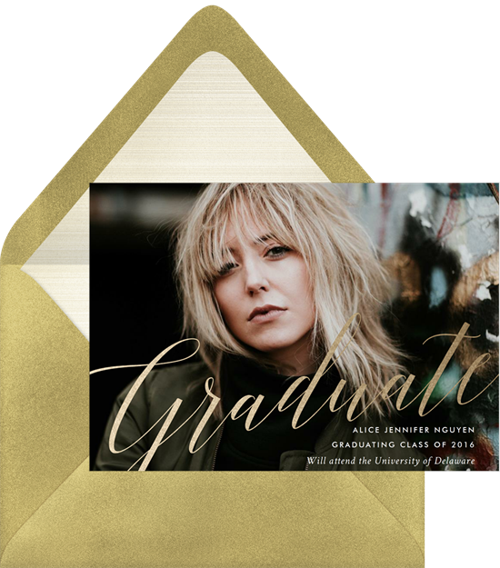 You are not the same person who waltzed onto campus four years ago. As a freshman, you weren’t sure of your identity, your major, or where you wanted to go in life. But standing here as a graduating senior, you know exactly who you want to be and the impact you want to have. To celebrate the person you’ve become — a person you love and are proud of — send out this photo graduation announcement with the word “graduate” written in gold foil calligraphy.