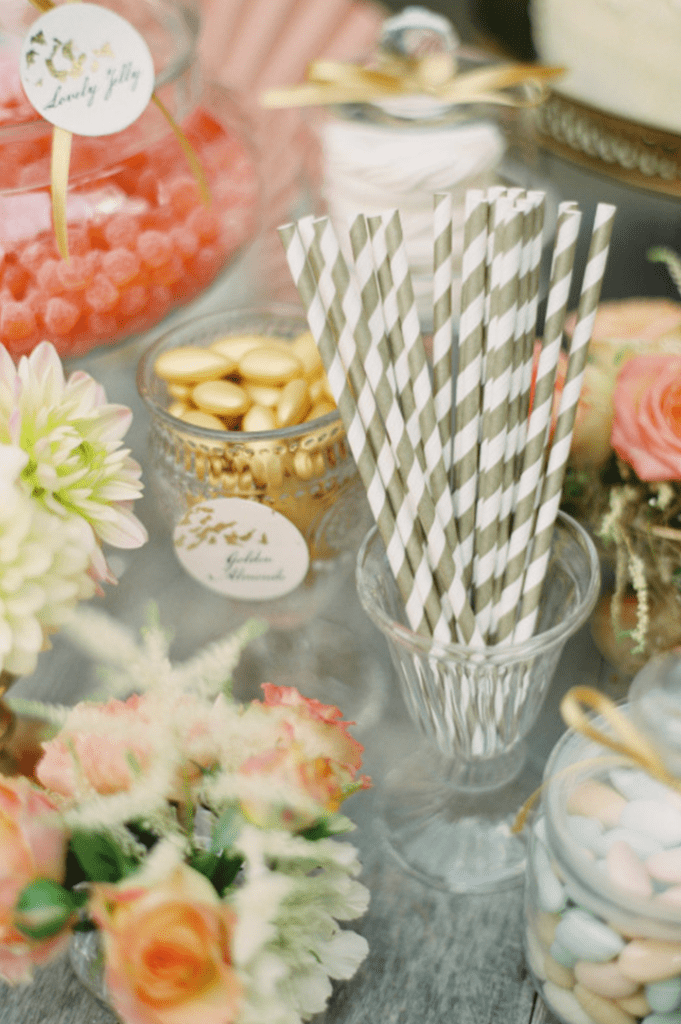 Candy bars are both eye-catching and delicious. Your guests will love going home with an array of hand-picked sweets! Make sure your bar stands out by incorporating varying heights of stylish jars and decorative scoops. We also recommend choosing your candies by hue to match your overall color palette (like this lovely candy bar featured on Wedding Sparrow!) The varying shades of peach, light gray, and pops of gold blended beautifully into the overall wedding theme.