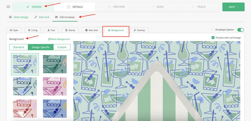 - Once you’ve finished editing your design (at least for the time being; you can easily navigate back to this step at any time), click “Next” to move on to “Edit Envelope”.