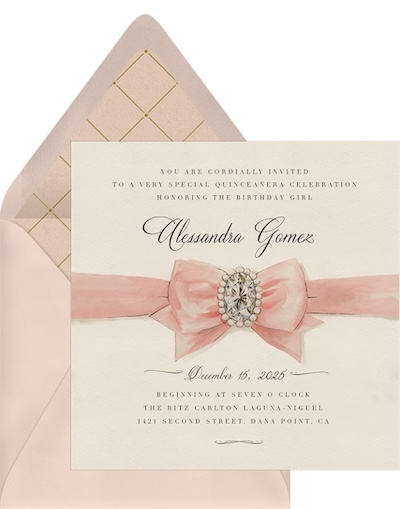 Opt for elegance with this milestone birthday invite featuring a satin ribbon and diamond brooch. Elegant typography and a decorative liner elevate the look of this invitation, and there’s plenty of room on the front and backsides for your event details.
