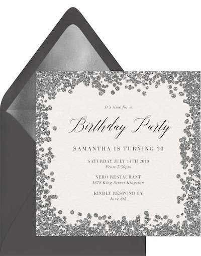 Use this silver birthday invitation to match the theme of your silver-inspired diamond party. Guests will be counting down the days until they can say “happy birthday” at your special event surrounded by glittering gems and silver decor.