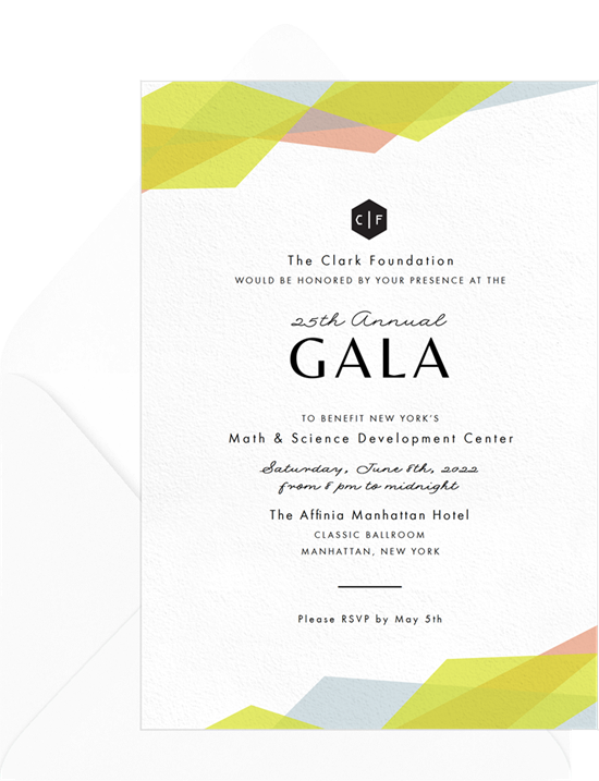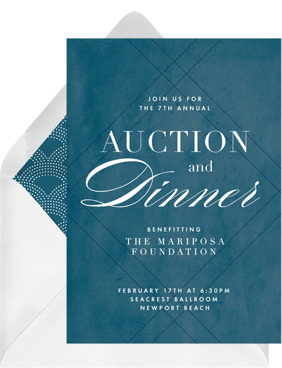 If you’re looking for a design that’s both elegant and understated, this muted motif invitation is ideal. The warm colors and soft background make a welcoming first impression. For dinners in aid of a charitable cause or foundation, this example features some useful wording to inspire your own.