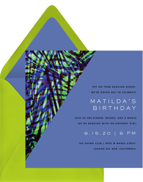 Make a colorful impression with this fun, modern party invitation. Whether you’re planning a tropical themed dinner party with delicious Caribbean food and cocktails or you’re a fan of the leaves and neon color scheme, this design is a winning choice.Â