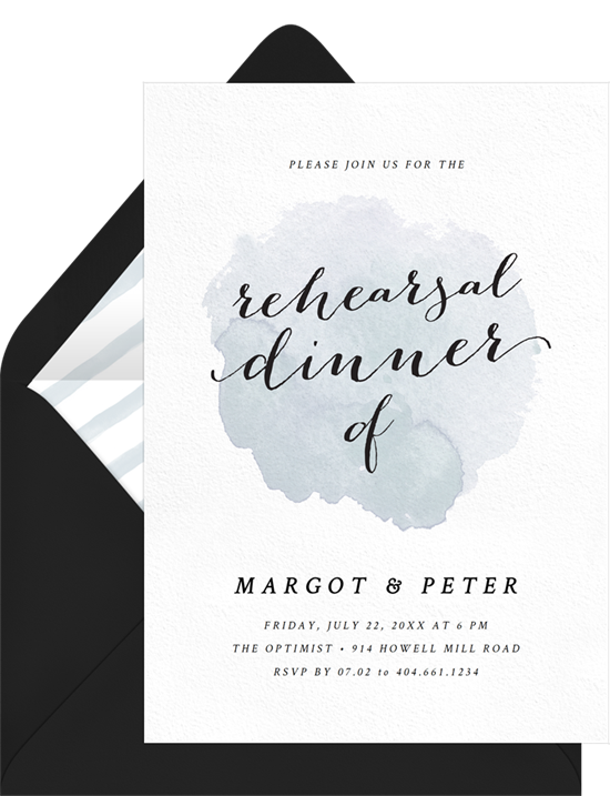 Invite your guests to join you for dinner with this beautiful modern dinner party invitation. Whether you’re hosting a formal meal or asking friends to join you for burgers and wine, this watercolor design keeps things simple and puts the focus on your event. While this example is for rehearsal dinner invitations, you can customize it for your dinner party with just a few clicks.