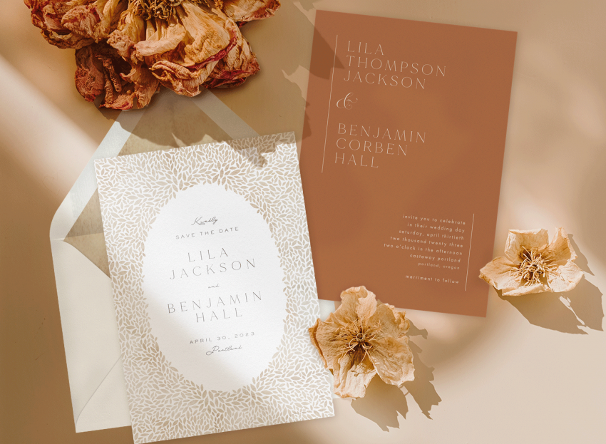You’ll also want to think about paper finish for your invitation design. Cotton and linen finishes add a touch of elegance to DIY wedding invitations while recycled cardstock is a great choice for eco-conscious couples or those hosting a rustic-themed wedding. Pocketfold invitations are fantastic if you want a seamless look since the invitation, RSVP card, and envelope are all integrated into one unit.