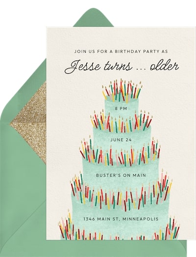 Celebrate that they’re turning yet another year older with this funny and whimsical birthday party invite. We love the gorgeous cake illustration and the mountains of candles decorating it — perfect for anyone with plenty of joy.