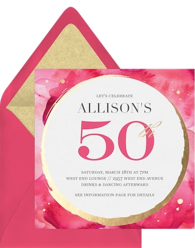 For a classy and sophisticated celebration, this champagne invite is just the ticket. The pastel watercolor background lends a soft and demure feel while the illustrated champagne flutes signal a celebration fit for a king or queen. It’s also a lovely choice for other milestone moments including bridal showers.