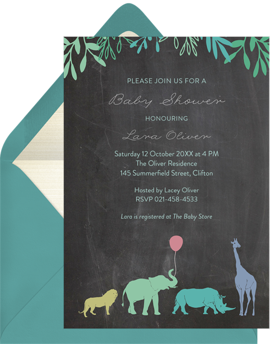 We love the charm of this safari-themed baby shower invitation. Along with a sweet elephant, the safari mama design features a lion, rhino, and giraffe that look like they’re about to join you at the party. Select your favorite look from chalkboard or textured paper backgrounds, each with their own unique style. There’s also space to add details about your registry so people can discover what you want the most.