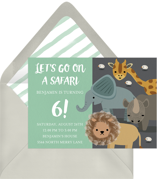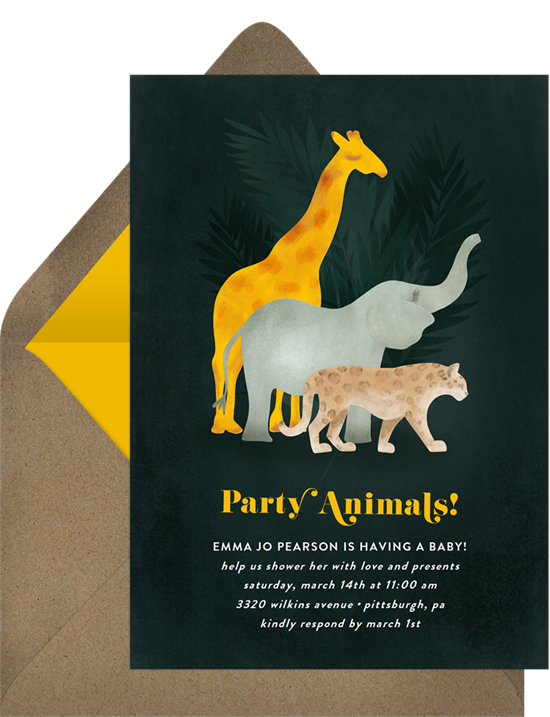 We think the design of these safari party invitations is adorable — just look at that lion’s mane! Instead of using these invitations for a birthday party, customize the text to welcome loved ones to your baby shower or baby sprinkle instead. With a design this sweet, it’s easy to remember to RSVP. Choose from five color options or tie your invitation into your baby shower theme with a custom colorway.