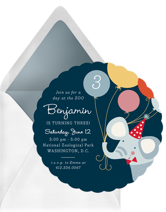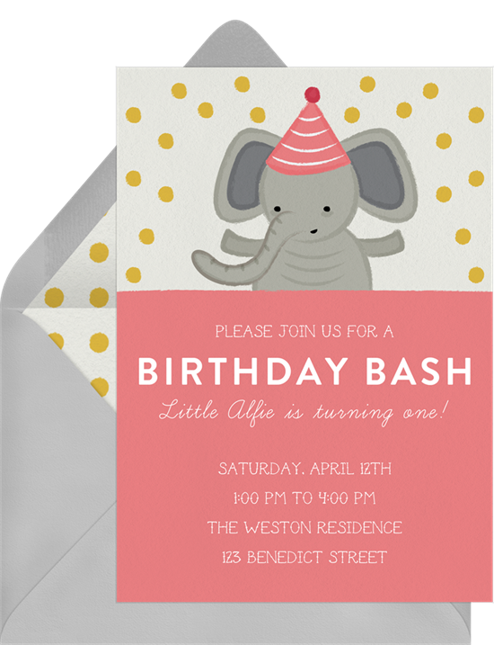 This fun, modern party invitation could easily become your perfect baby shower invitation with just a few changes to the text. Swap out “birthday bash” for “baby shower,” and you’re all set. With a playful, illustrated design, this party elephant invitation keeps it simple so the focus is on the party details. Pick from five colorways or make it your own with a custom color — the choice is yours.