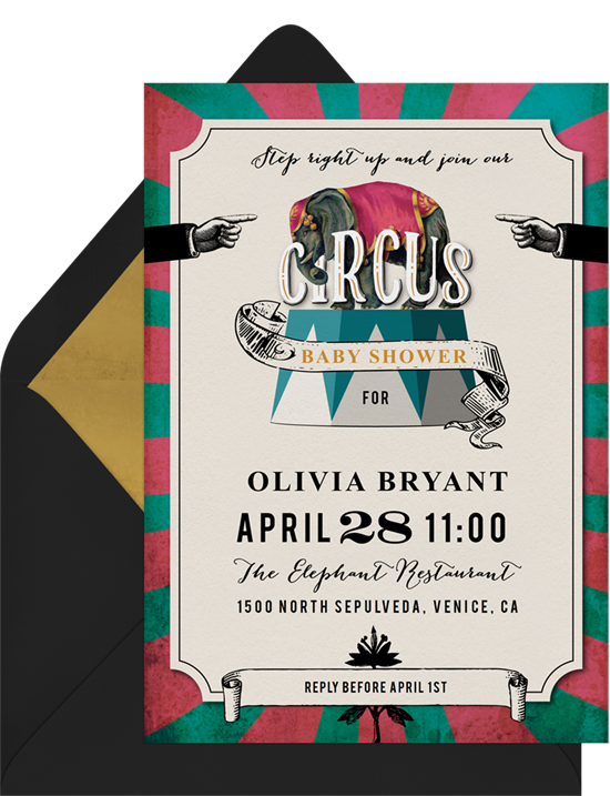 If you love the circus theme but want something more subtle, the party time elephant baby shower invitation could be just what you’re looking for. This sweet digital design features a rustic texture background and stars as a nod to the circus world, which makes it great for both themed and not themed gatherings. There are plenty of color options to customize the accent and envelope color, so you’re sure to find something that matches your style.