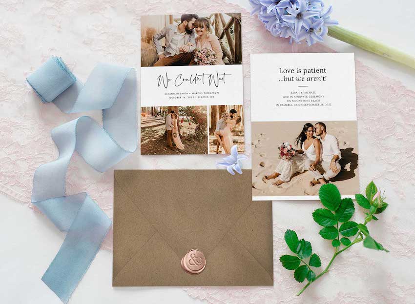 One of the best ways to share the big news is with a gorgeous photo card featuring you and your new spouse. Work with your wedding photographer or a specialized elopement photographer to get some of your wedding photos early. That way, you can share a snap of your wedding day with your loved ones exactly when you choose. If that’s not possible, book a photoshoot beforehand or commission an illustration of the two of you as newlyweds.