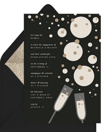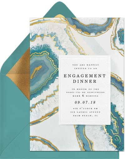Toast to the future Mr. and Mr./Mrs. and Mrs./Mr. and Mrs. with this bubbly engagement party card design. Featuring a modern vibe with geometric designs and metallic elements, it’s sure to catch the eye of your guests — and they’ll be hitting yes to RSVP to your brunch engagement party. You can also use this design to celebrate other memorable fêtes including New Year’s or Valentine’s Day.