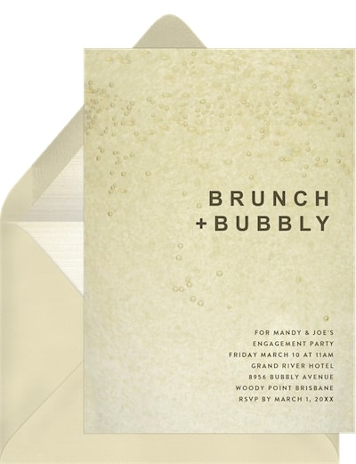Since we know the bubbly stuff is the star of brunch, why not choose an invitation that focuses on champagne? Sleek rose gold foil lettering pops against a black background. Graphic typography declares, “Pop the champagne,” and your party details are interspersed throughout in smaller text. The elegant style can also work as a chic bachelorette party invitation, rehearsal dinner invitation, or holiday engagement invite.
