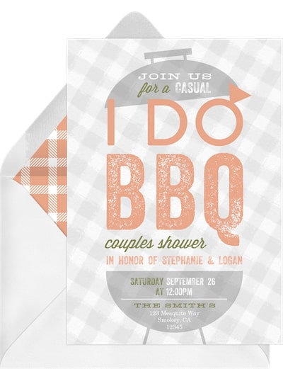 Perfect for a couples shower or barbecue engagement party, this clever invitation has it all. A graphic charcoal grill flanks stylized text that reads, “I do BBQ,” with a special diamond on the O. Below, a subtle gingham pattern drives the picnic theme home. Choose from summery peach, mustard, green, or turquoise on a soft gray background.