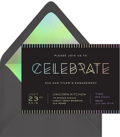 This flexible invitation can work for everything from birthday parties to graduation announcements, but we like it best for a free-wheeling engagement party. Gradient rainbow hues set the tone for a fun affair, and contemporary text lends graphic appeal. If rainbow isn’t your speed, choose from a sleek black and rose gold foil or a classic gray and black design.