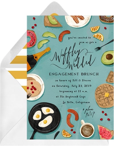 Hand-drawn illustrations of buttery waffles, avocado toast, and bottles of bubbly take center stage on this artsy invitation. A mix of stylish hand-script and retro fonts lend a throwback aesthetic for couples who never go out of style. Waffley Wedded can also work if you’re hosting a family brunch the day after your nuptials.