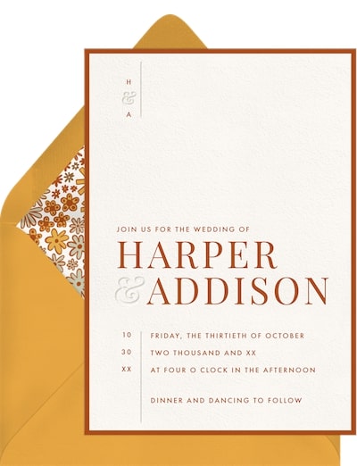 For each of the fall or autumn wedding color schemes below we’ve added a suggested digital invitation. Our collection of wedding invitations has something for everyone — whether you want elegant, sophisticated, whimsical, traditional, boho, or another theme of your choice. Every invite can be customized, so you can experiment with layouts, fonts, colors, and wording until you have your dream invitation.