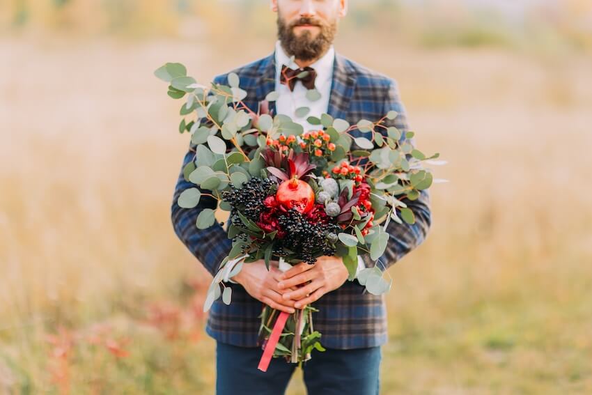 Another classic fall wedding color is burgundy. This deep red-purple hue is popular for the way it effortlessly highlights a white or off-white wedding dress or suit, and it’s also perfect for a late fall wedding if you want a festive vibe.