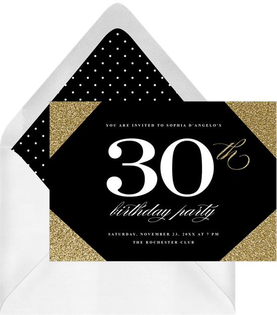 This regal invitation may be designed for a 30th birthday, but you can easily customize the text for an upcoming 50th, 60th, or even 70th birthday celebration. Featuring gold glitter corners and a luxe, black background, this 50th birthday invite has just the right amount of glam for the momentous occasion. Using Greenvelope’s easy customization tool, simply swap out a “3” for a “5,” add your event details, and you’re ready to party.