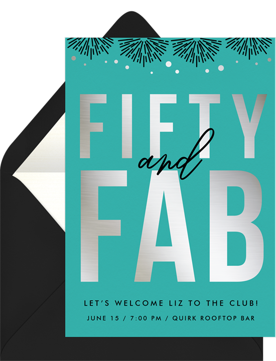 While some people want a formal, sit-down dinner for their fiftieth, you want nothing of the sort. Nope, for your celebration, you’re picturing one grand fiesta with all of your children, family, friends, and neighbors. This fabulous 50th birthday invitation is just the ticket, with bold, festive colors and metallic lettering. For party decorations, be sure to grab some string lights, stickers, balloons, and plenty of confetti to toss around.