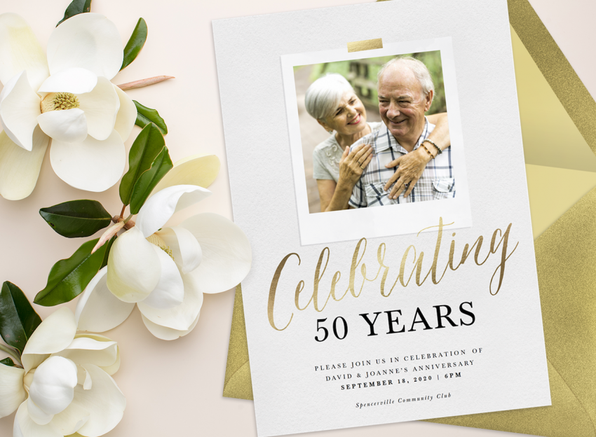 Now that you’ve sorted out all the details for the anniversary party, it’s time for the fun part—creating the invitation! Choose a design that reflects the couple’s personality and matches the 50th wedding anniversary theme or decor style. Here are a few ideas to help you get started.