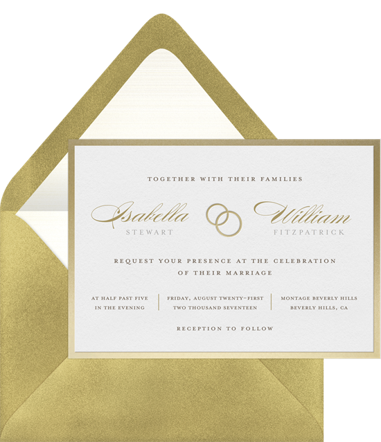 You’ll need to pick out your stationery, decide what to write, and finalize your invitation wording. And while this is your big day — and therefore you, and only you, make the rules — we have a few suggestions for formalizing all of the above. Below, you’ll find wedding invitation etiquette, selected messages to include, and a few sample designs that make an excellent fit for a formal wedding.
