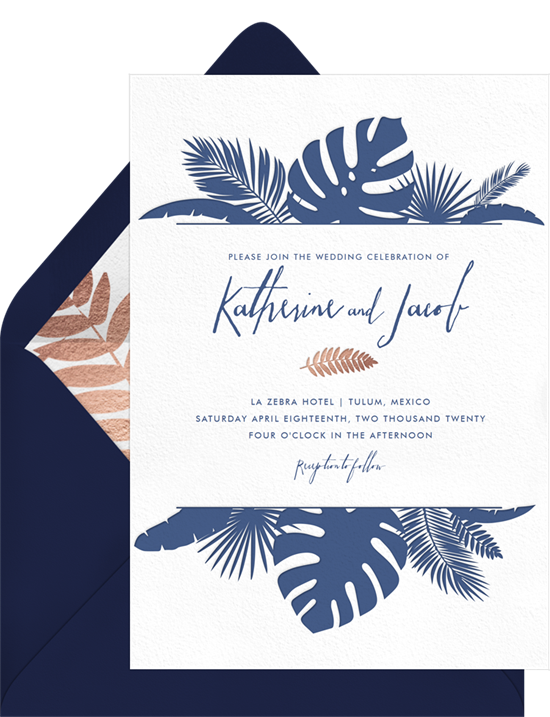 You can still dip your toes in the sand while throwing a formal wedding. This beach-inspired invitation is ideal for destination or outdoor weddings, featuring letterpress botanicals and an almost nautical color palette. Rose gold accents give this wedding invitation an elegant flair, as do the midnight blue envelopes. A white save the date card captures a photo of the happy couple, while the thank you note matches the floral invitation.