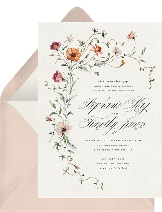 This romantic yet traditional wedding invitation features large calligraphy and a subdued watercolor palette. On the left side of the card, you’ll see illustrated flowers, a design that’s carried through the entire invitation suite. If you’re hosting a spring or fall formal wedding, this beautiful invitation may be exactly what you had in mind.