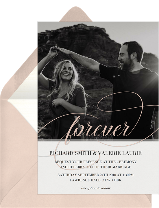 This classic wedding invitation features a calligraphy script, transcribing the word “forever” across a photo of the couple. Below, you’ll see the two names and the details of the ceremony.