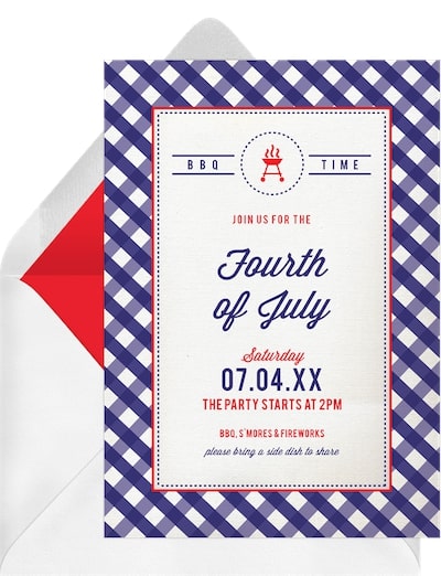 This gingham-bordered invitation is perfect for a Fourth of July picnic. Whether you’re hosting a neighborhood block party or a cookout at the lake, this invite sets the stage for a classic gathering with good food, a friendly cornhole competition, and sparklers.Â