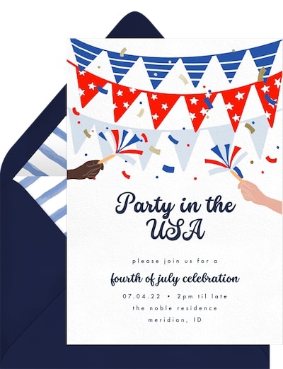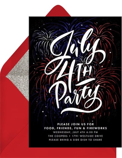 This glam invite features delicate, glittering fireworks and elegant text, making it perfect for more upscale Fourth of July celebrations. It can also be customized if you’re hosting other special events on Independence Day, so you can use it as a bridal shower or wedding invitation.
